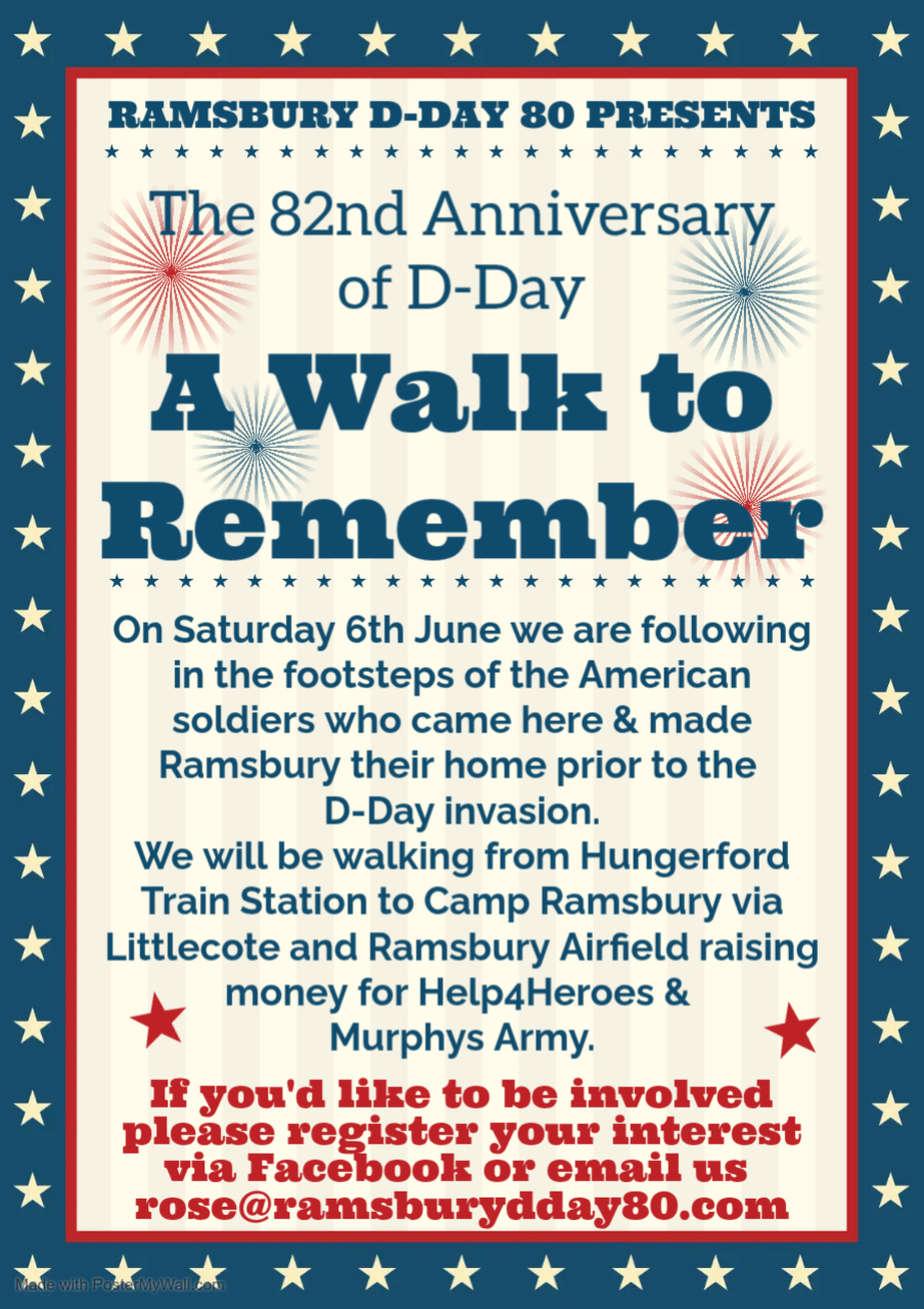 Leaving Hungerford Train Station stopping at Littlecoate House Hotel for a comfort & refreshment break before walking up to Ramsbury Airfield for a service of remembrance. Then down to the Rockery for a short break before the friendly Invasion Event starts. contact Rose if you would like to get involved. Rose@ramsburydday80.com